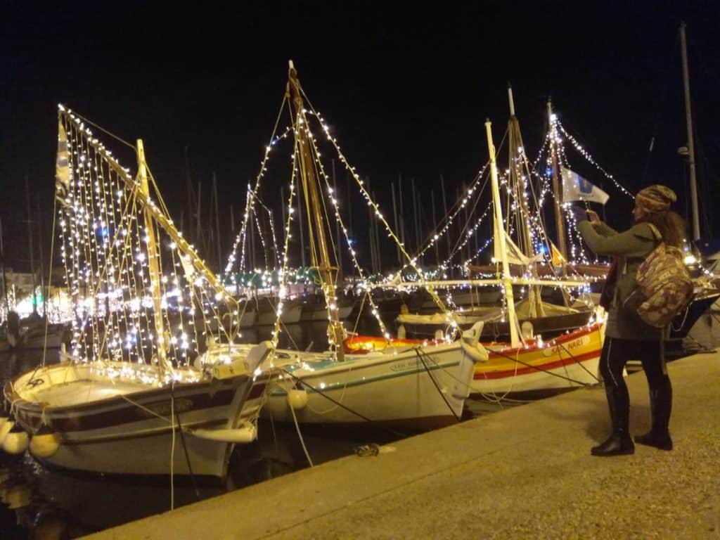 The beautiful old port did not disappoint. From the parking I was seduced by dozens and dozens of traditional pointus Provencal fishing boats decorated with lights. Their masts and sails wearing diamond chains as they shimmer before my eyes.