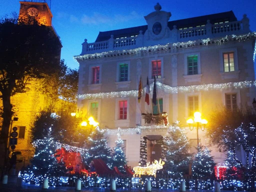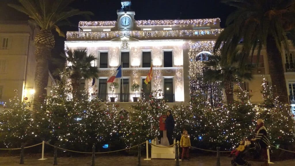 On the pier, the beautiful city hall building is intensely decorated with Christmas lights and a forest of Xmas trees stands before it. Saint-Nazaire church with its famous cross is dressed in lights for the ocassion, as is the famous Tower of Sanary from 1300. All along the pier, statutes, buildings, street lights, are dressed in lights. I am almost blinded.
