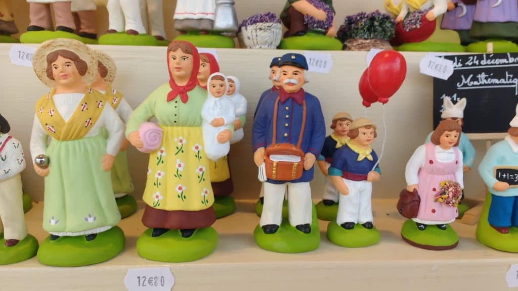 Santons means “little saints” in old Provençal. They are actually handmade nativity scene figurines made in the Provence region of France. There are 55 figurines representing different characters from the nativity scene and from Provençal village life such as: the grinder, the priest, the gypsy girl, the water carrier, the fish woman, the blind man and the chestnut seller.